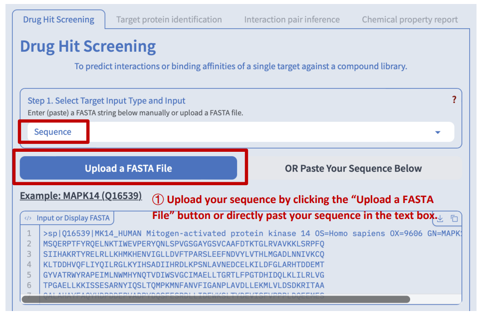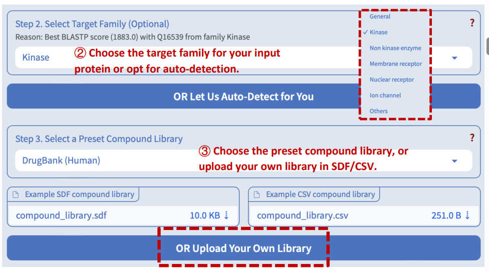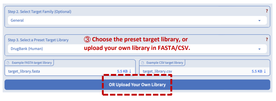 DeepSEQreen currently provides two pre-set protein libraries: DrugBank and ChEMBL (v33). More pre-set libraries will be added soon. Additionally, users have the flexibility to upload their own custom library in either FASTA or CSV format. Example files are available for users to try out the functionality or download in order to guide them on the required formatting for their custom libraries. Users can also refer to the DeepSEQreen documentation for detailed instructions on the formatting requirements for custom libraries.