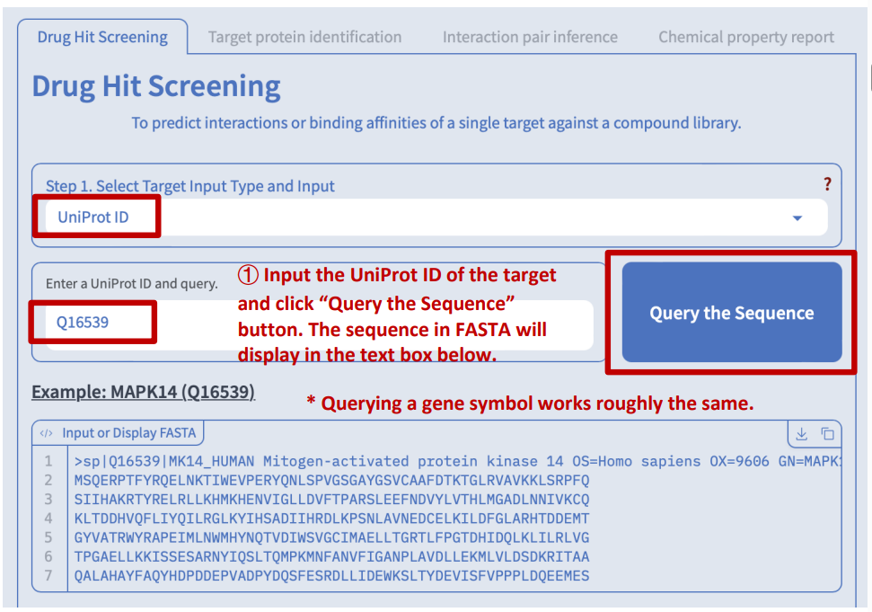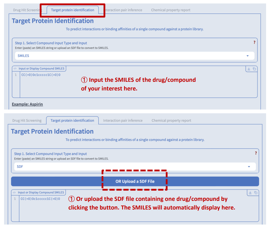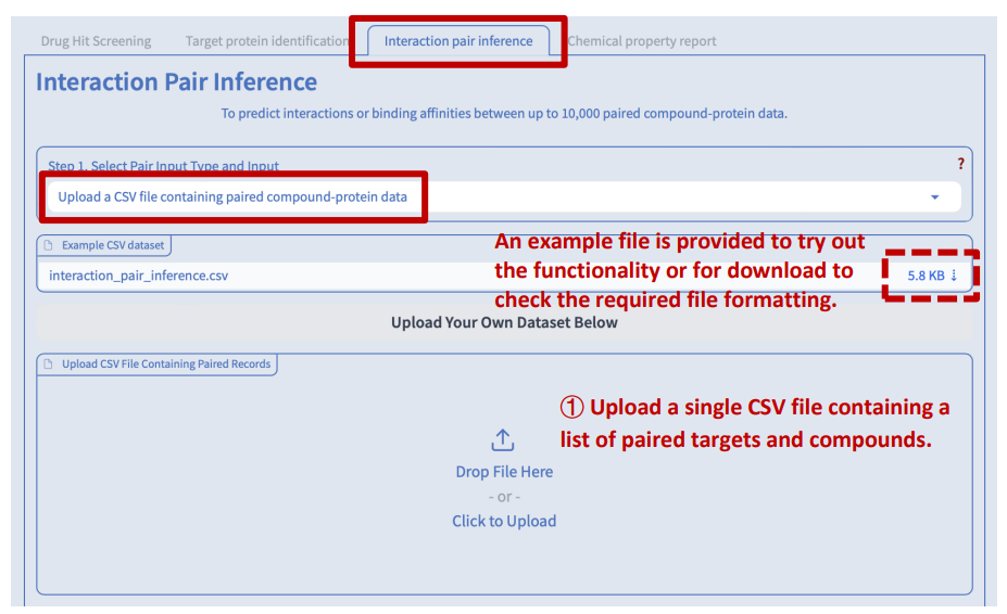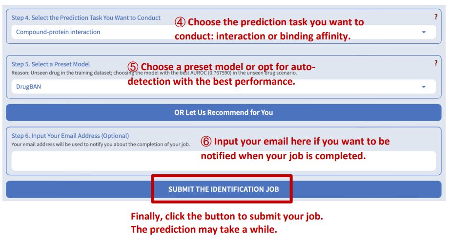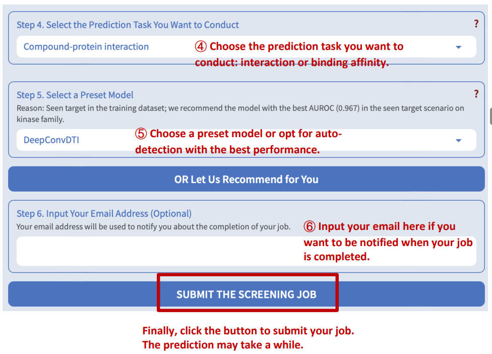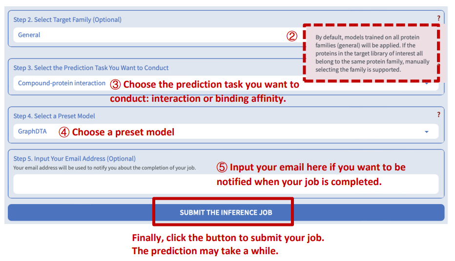 Switch to the “Interaction pair inference” tab. There are four major steps before you can submit your job to prediction the interaction probability or binding affinity between the input compounds and target proteins: