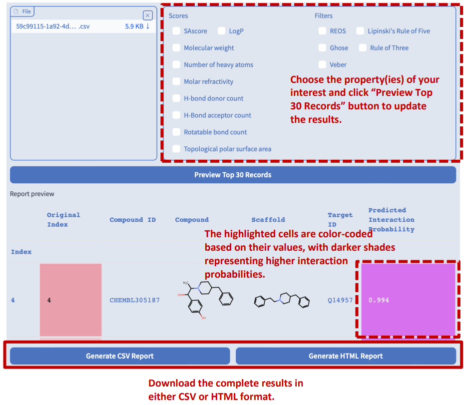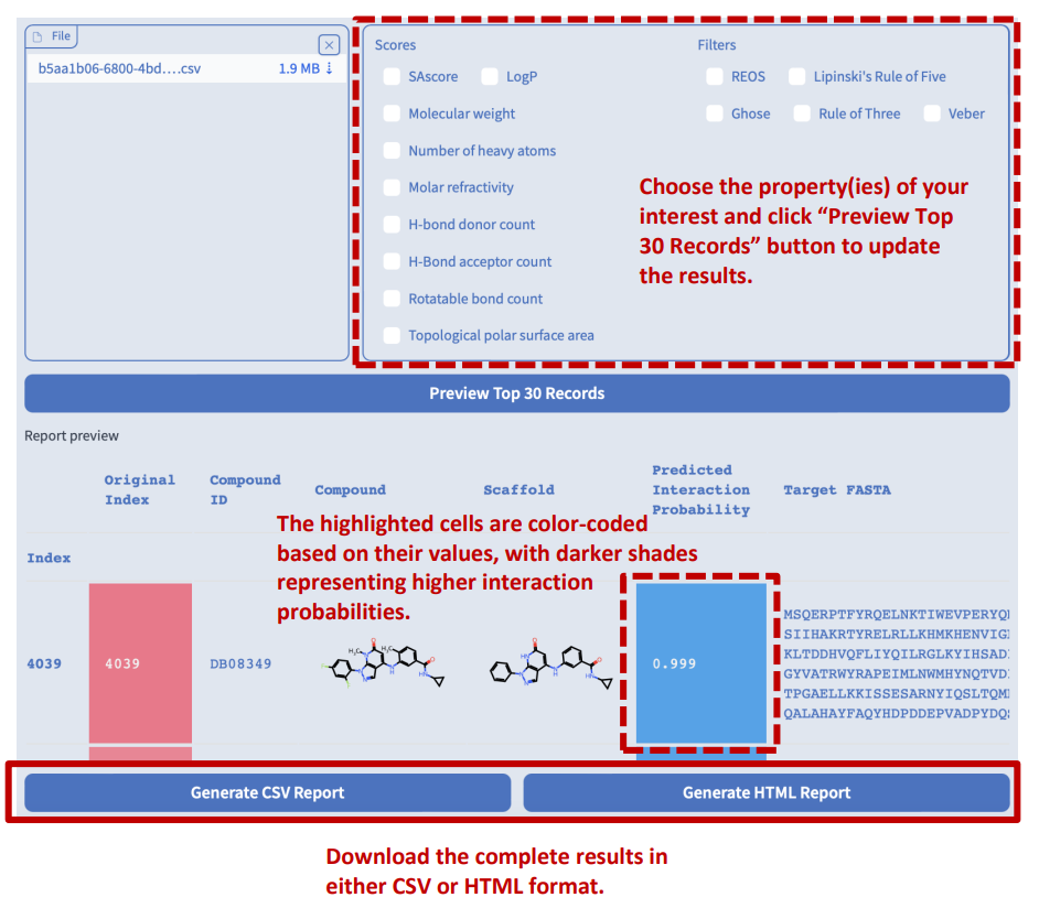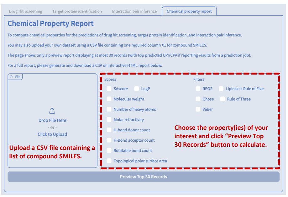 Switch to the “Chemical property report” tab. In addition to displaying preview reports for drug hit screening, target protein identification, and interaction pair inference tasks, users can also upload a CSV file containing a list of compound SMILES to calculate their basic chemical properties, synthetic accessibility measures, and drug-likeness.