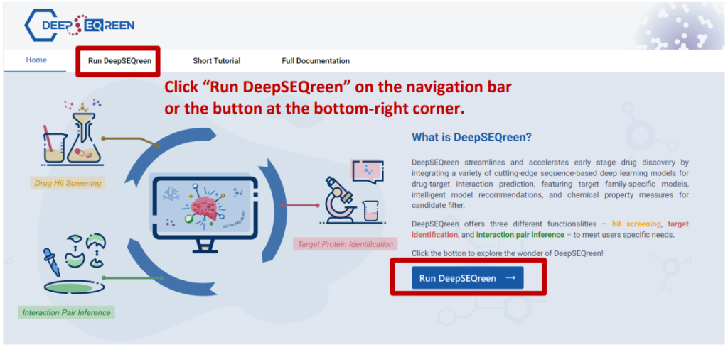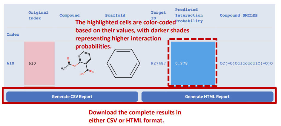 DeepSEQreen offers two prediction options: 1) the probability of the interaction between the input protein and the compounds in the library, and 2) the binding affinity between them.
