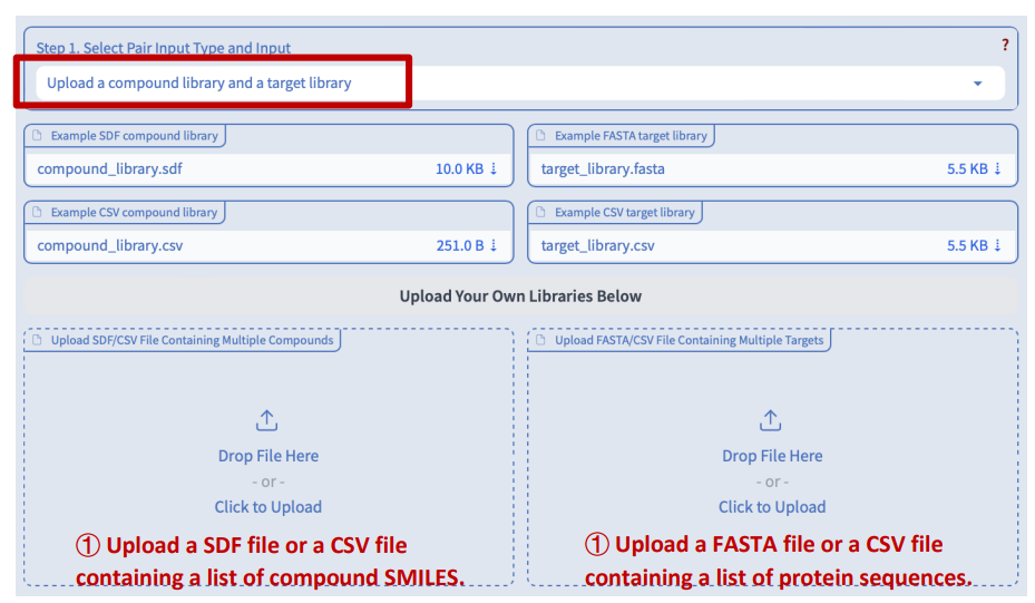We accept two types of input: 1) a single file containing a list of paired targets and compounds, and 2) two separate files containing lists of target proteins and compounds respectively.