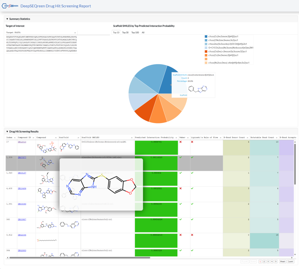 This is an example of an interactive HTML report generated by Drug Hit Screening. You can explore the report in the following ways: